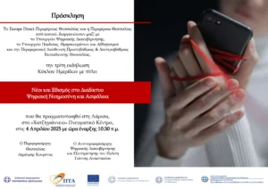 H Περιφέρεια Θεσσαλίας σε συνδιοργάνωση με το Υπουργείο Ψηφιακής Διακυβέρνησης, το Υπουργείο Παιδείας, Θρησκευμάτων και Αθλητισμού, το Περιφερειακό Ταμείο Ανάπτυξης Θεσσαλίας, το Europe Direct Περιφέρειας Θεσσαλίας και την Περιφερειακή Διεύθυνση Πρωτοβάθμιας & Δευτεροβάθμιας Εκπαίδευσης Θεσσαλίας σας προσκαλούν να τιμήσετε με την παρουσία σας την τρίτη εκδήλωση Κύκλου Ημερίδων με τίτλο: Νέοι και Εθισμός στο Διαδίκτυο, Ψηφιακή Νοημοσύνη και Ασφάλεια.